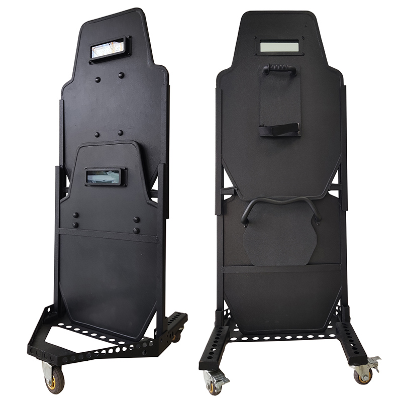 The Level III+ and Level IV armored mobile barrier with trolley is a new development which has addressed the need to provide a robust, stable and highly maneuverable shield platform for shield deployment whilst at the same time enabling rapid shield dismounting from the platform for hand-held operations.