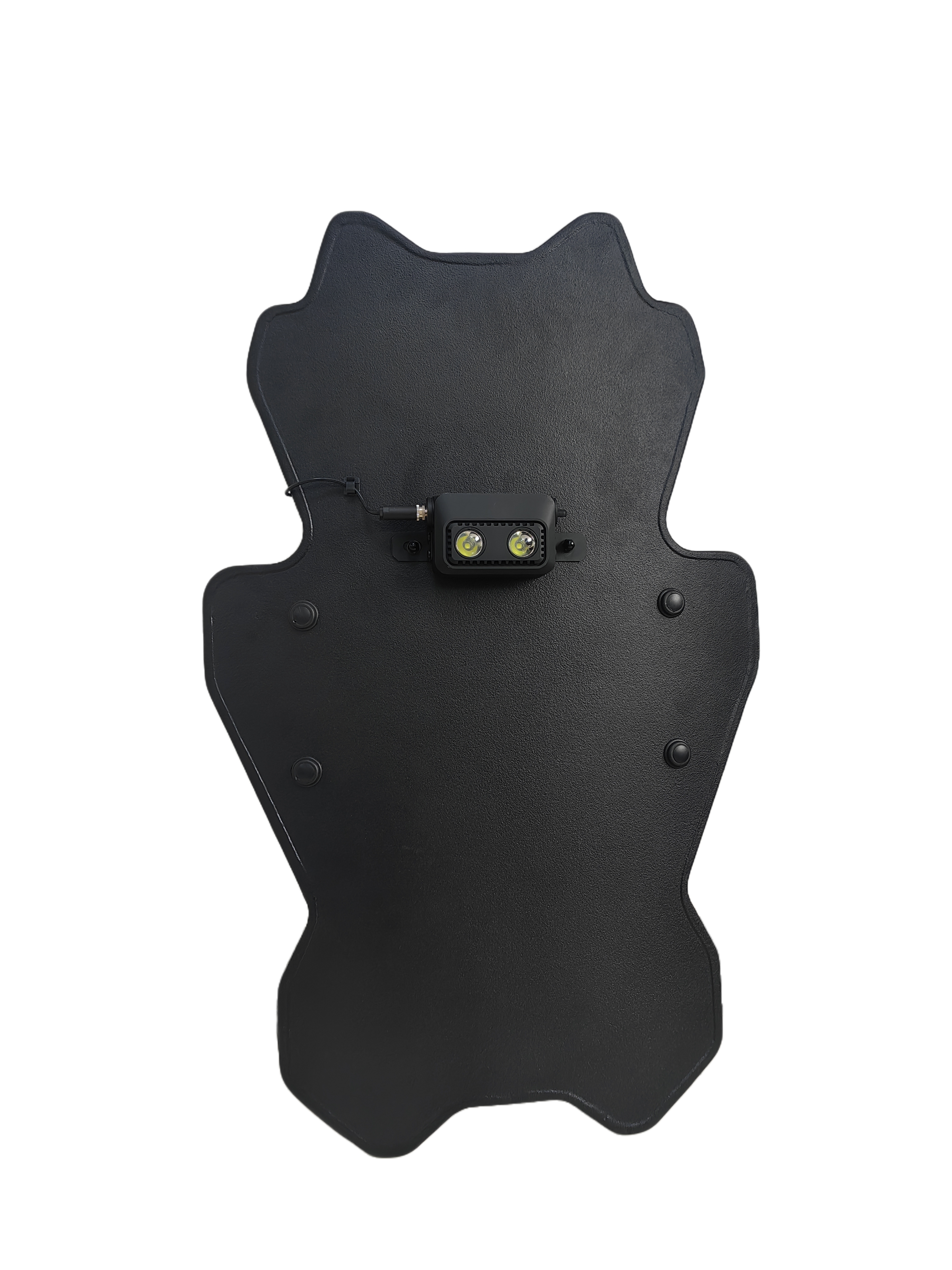 The shield is constructed from 100% UHMW PE and ceramic tiles and is rated to NIJ Level III+ and Level IV. This unofficial level covers the traditional NIJ Level III performance for 6 strikes of 7.62 × 51mm NATO Ball (M80 Ball) and also the widely recognized threat from 7.62 × 39mm MSC, 5.56 × 45mm M193 / SS109, and 7.62 × 63mm AP.
